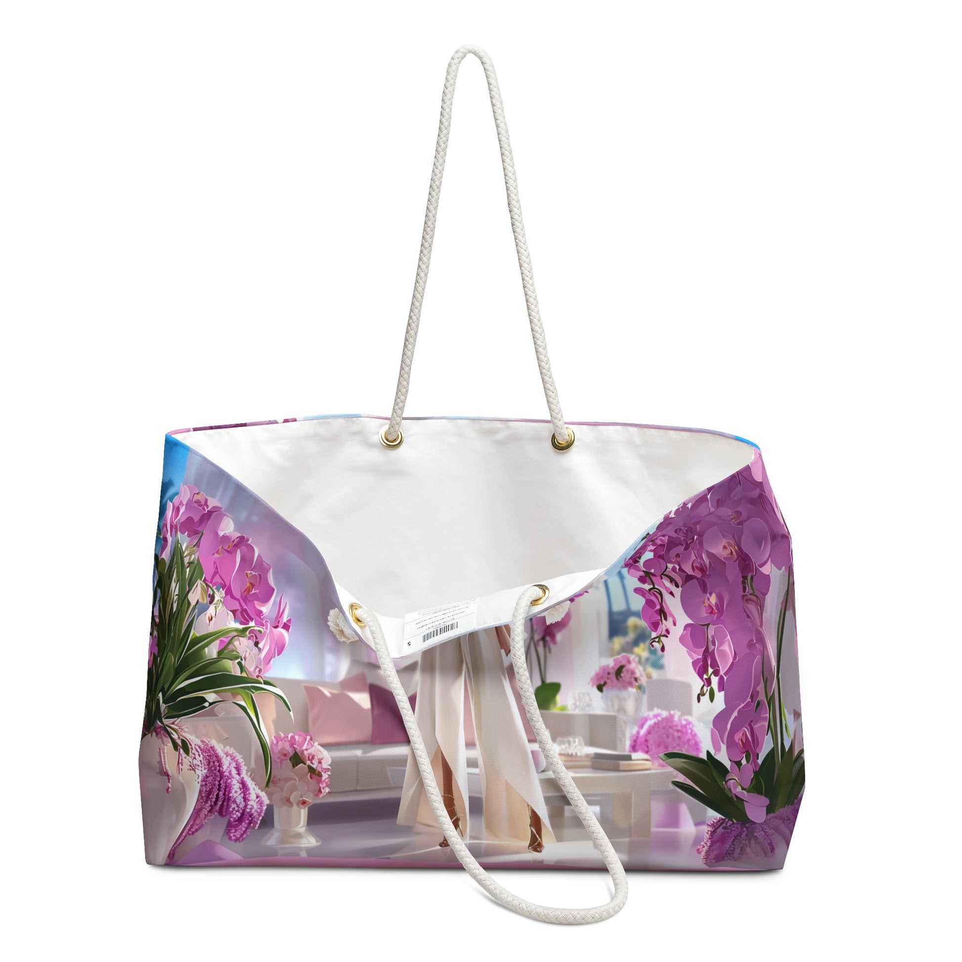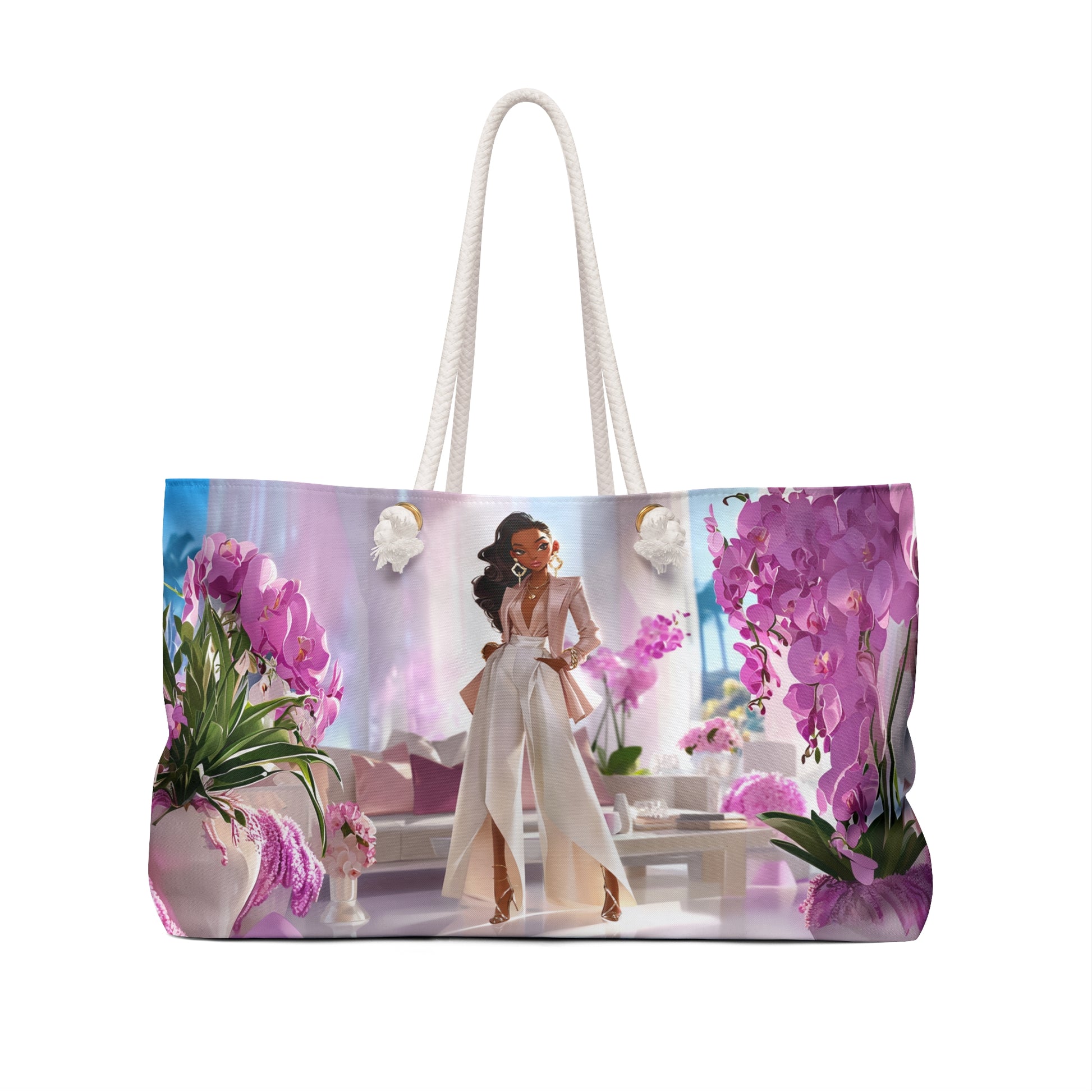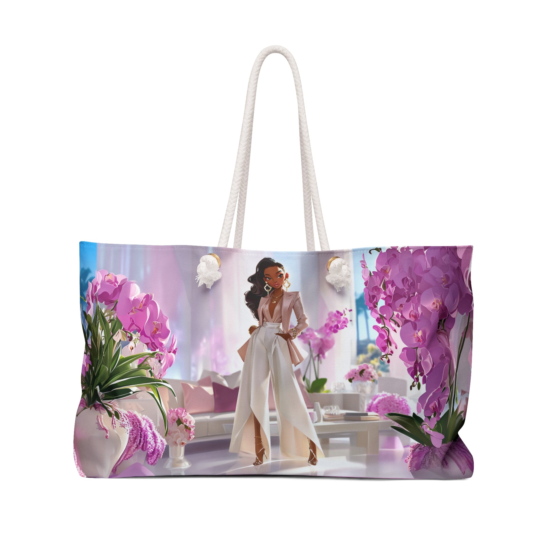 The Blush Ambition Weekender Tote is where soft meets savage. Wrapped in a palette of orchid pinks and elegant whites, it features a poised beauty standing in a luxe lounge dripping in floral fantasy. With gold accessories and goddess-level attitude, this tote brings your inner CEO to life.