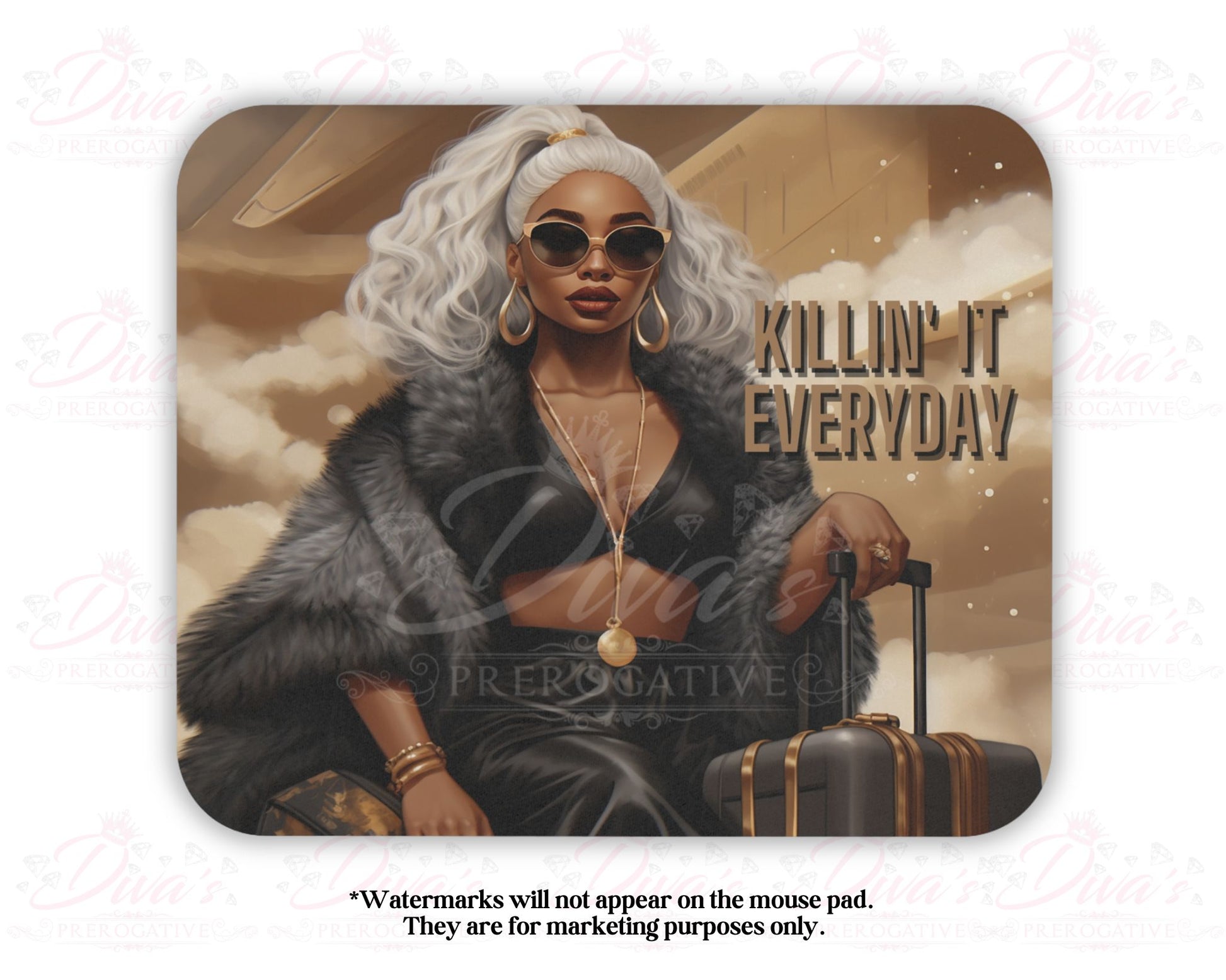 Elevate your workspace with the empowering "Killin' It Everyday" Mouse Pad, featuring a bold illustration of an African American woman radiating confidence and style. Perfect for adding a touch of motivation and sophistication to your office or home desk setup.