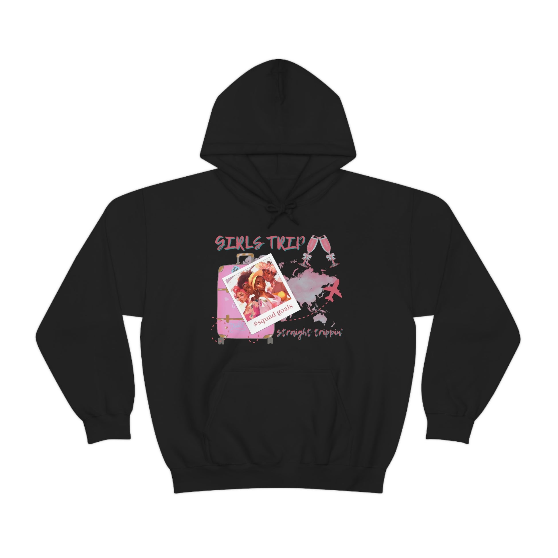Get ready to take on your next adventure in style with the ultimate Girl's Trip Hoodie! Made with a plush blend of cotton and polyester, this unisex heavy blend hooded sweatshirt is pure relaxation. Perfect for any chilly day, you'll love the soft and warm feel of this trendy hoodie. The spacious kangaroo pocket in the front adds practicality to your daily routine while the same-colored drawstring of the hood brings extra style points. Crafted with a medium-heavy fabric weighing 8.0 oz/yd² (271 g/m²), this classic fit hoodie is both durable and comfortable. Plus, thanks to the convenient tear-away label, you won't have to deal with any annoying tags while you're on the go. Running true to size, this hoodie is the perfect addition to your Girls Trip wardrobe. So, whether you're exploring new sights or chillin' with your girls, the Girls Trip Hoodie is the perfect choice to keep you cozy and fashionable. This product is made-to-order. The processing time is three days.